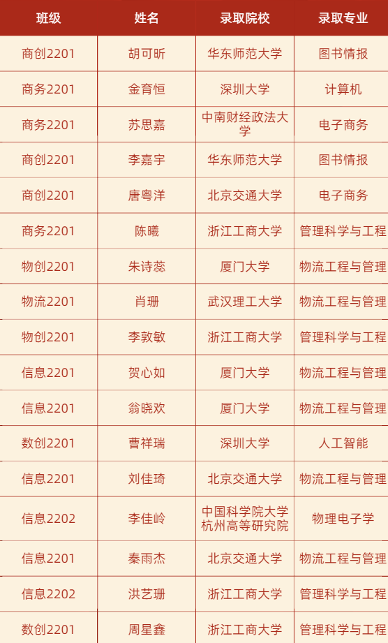 热烈祝贺:皇冠体育(正网) 管理工程与电子商务皇冠 (皇冠体育 )2022级推荐免试攻读硕士学位研究生工作圆满结束,我院学子凭借优异的成绩和出色的综合素质,在推免录取中大放异彩,成功被厦门大学、华东师范大学等多所国内知名高校录取!