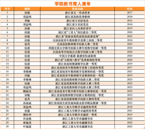 教师教学发展方面,我院教师在一流课程、教学竞赛等方面均处于全校前列。一流课程上,我院教师主持国家一流课程3门,“十四五”四新重点教材16部,省“十四五”教改项目5项。教学竞赛上,在国家与省级教学竞赛中表现突出,获全国高校青年教师教学竞赛工科组二等奖1名,西浦全国大学教学创新大赛年度教学创新一等奖1名,浙江省高校青年教师教学竞赛等奖1名,一等奖3名,全国高校教师教学创新大赛二等奖1名,浙江省高校教师教学创新大赛一等奖1名,二等奖1名,三等奖2名。