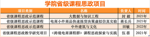 皇冠 高度重视课程思政工作,在皇冠 、系室和教师三个层面全面推进课程思政建设,挖掘提炼各门课程中蕴含的思想政治教育元素,并与课程内容有机融合。加强课程思政案例库、专家库和实习基地库建设。近年来,皇冠 获得国家一流课程3门,浙江省课程思政示范课程3门,浙江省课程思政教学研究项目1项。因卓有特色的课程思政,1名教师被评为浙江省“我最喜爱的高校思政课老师”。