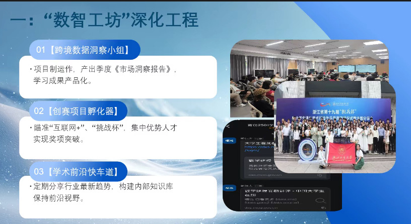 设立跨境数据洞察小组、创赛项目孵化器、学术前沿快车道,推动学术成果转化与竞赛突破,保持行业前沿视野。