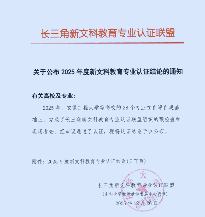 近日,长三角新文科教育专业认证联盟发布了《关于公布2025年度新文科教育专业认证结论的通知》,我院物流管理专业通过认证,认证结论有效期为4年,即2026年1月至2029年12月,该专业系我校首个通过此项认证的专业。